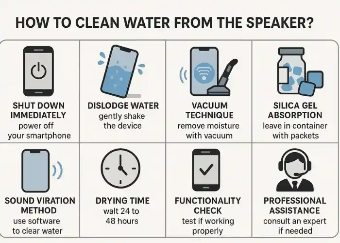 Gently shake the device, and the water will be expelled from it. After that, place a cloth near the speaker.
