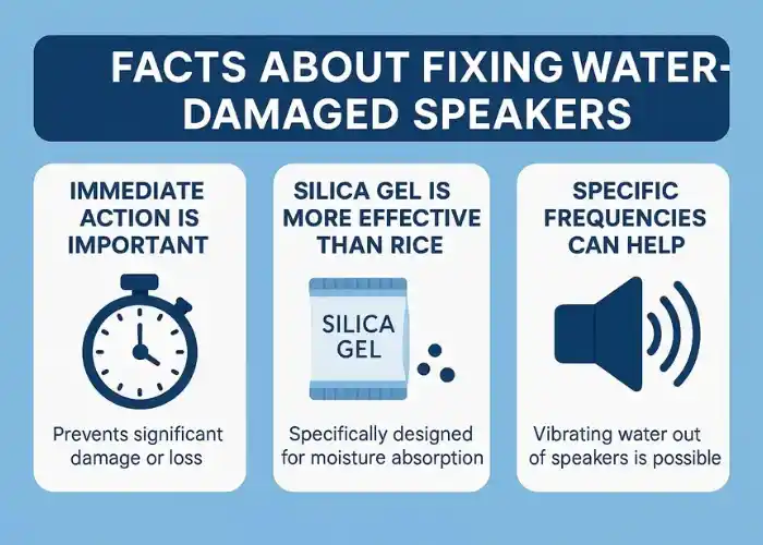 Vibrating water out of speakers is possible with specific sound frequencies. Although it can be part of an effective drying strategy, use it carefully to avoid further damage.
