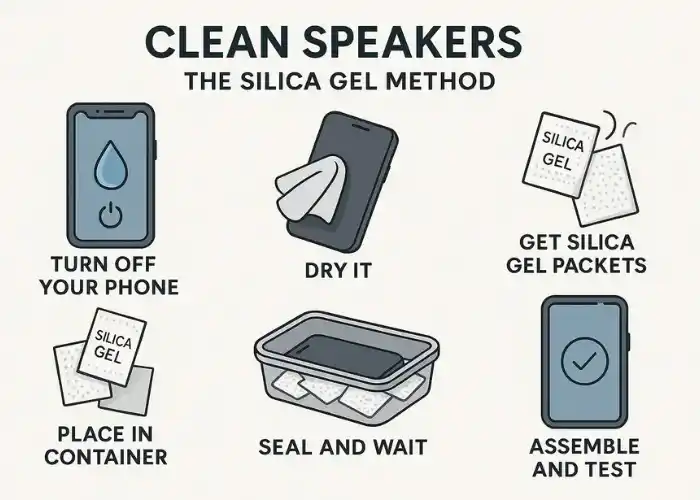 This is a safe and effective way to remove dust and water particles from the speaker or to evaporate them. This technique is efficient as it deals with water droplets without opening your device.